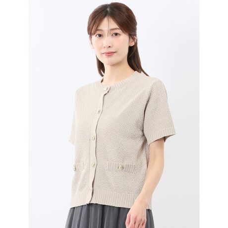ジャケットのような上品さを漂わせる、半袖のニットカーディガンです。すっきりとしたクルーネック、上品なゴールド調のボタン、飾りポケットがポイント。羽織りとしてもプルオーバーとしても着回せるデザインです。