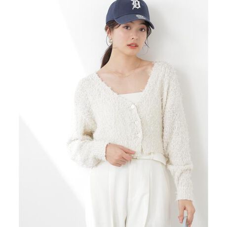 短丈ながらルーズなシルエットが可愛いカーディガン。春らしいチュールテープヤーンと控え目なラメ糸が、動くたびにきらっと映えます。シンプルなデザインなので、幅広いスタイリングに活躍する着回し力の高い一枚です。
