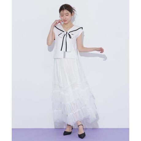 イレギュラーなチュールフリルが目を引くフレアスカート。動くたびに揺れる立体的なシルエットで華やかな印象に見せてくれます。ランダムなカットラインが甘さの中に抜け感をプラス。ウエストはすっきりとしたデザインで、トップスインもキレイに決まります。シンプルなトップスと合わせるだけで主役になれるフェミニンな一枚です。※撮影時照明の関係により、色味が違って見える場合がございます。またパソコン・スマートフォンなどの環境により、若干製品と画像のカラーが異なる場合もございます。予めご了承ください。商品の色味は、商品単品画像をご参照下さい。※商品画像はサンプルのため、色味やサイズ等の仕様に変更がある場合がございますので、予めご了承ください。
