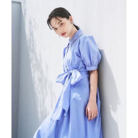 レイヤード風の衿が印象的なシャツワンピース。タック入りパフスリーブとボリュームフレアスカートが女性らしい動きをプラスし、高めウエスト切り替えで脚長効果を狙えます。後ろウエストはゴムで見た目はすっきり、着心地はラクな仕様に。共地ウエストリボンで可愛らしさを叶えれくれます。