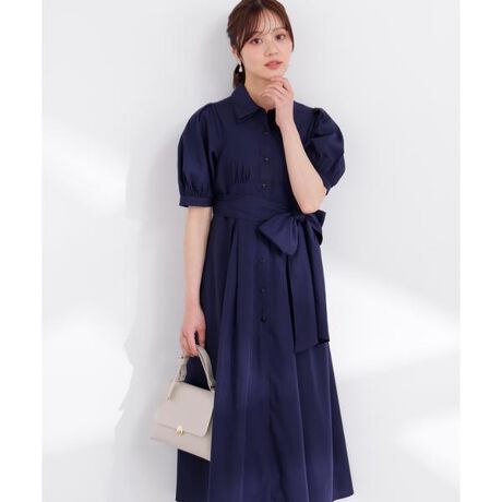 レイヤード風の衿が印象的なシャツワンピース。タック入りパフスリーブとボリュームフレアスカートが女性らしい動きをプラスし、高めウエスト切り替えで脚長効果を狙えます。後ろウエストはゴムで見た目はすっきり、着心地はラクな仕様に。共地ウエストリボンで可愛らしさを叶えれくれます。