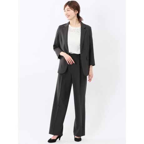 ジャケットはボディラインに自然に沿ったベーシックなシルエットです。パンツはストンと落ちる直線が美しい、太すぎないセミワイドです。脚のラインを隠せるので体型カバーや脚長効果も期待できます。