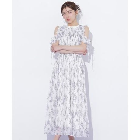 発色の良い爽やかなカラーが映えるフラワーワンピース。肩を華奢に見せるフリル位置や、二の腕をカバーするプリーツフリルとリボンで、華やかさと着やすさを両立したデザイン。被り仕様で着脱も簡単にでき、ウエストのシャーリングはフィット感がありながら締め付けすぎない着心地です。シアー素材にプリーツをあしらった軽やかで上品な一枚です。※撮影時照明の関係により、色味が違って見える場合がございます。またパソコン・スマートフォンなどの環境により、若干製品と画像のカラーが異なる場合もございます。予めご了承ください。商品の色味は、商品単品画像をご参照下さい。※商品画像はサンプルのため、色味やサイズ等の仕様に変更がある場合がございますので、予めご了承ください。