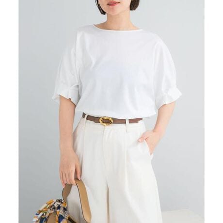 タックを施した立体的なスリーブが目を引く、上品な印象のカットソー。ほどよいハリとストレッチ性を兼ね備えた素材は、やわらかな風合いの中に艶感もあり、ブラウスのようなきちんと感を演出してくれます。肌に触れた瞬間にひんやりと感じる接触冷感とUVカット機能付きで、暑い季節も心地よく過ごせるのも魅力。身体のラインを拾いにくいシルエットに加え、袖のデザインが自然に腕まわりをカバーし、華やかさをプラスします。前後差のある着丈はアウトスタイルもバランスよく決まり、スラックスやストレートスカートと合わせれば、すっきりと洗練された着こなしに仕上がります。