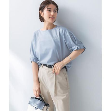 タックを施した立体的なスリーブが目を引く、上品な印象のカットソー。ほどよいハリとストレッチ性を兼ね備えた素材は、やわらかな風合いの中に艶感もあり、ブラウスのようなきちんと感を演出してくれます。肌に触れた瞬間にひんやりと感じる接触冷感とUVカット機能付きで、暑い季節も心地よく過ごせるのも魅力。身体のラインを拾いにくいシルエットに加え、袖のデザインが自然に腕まわりをカバーし、華やかさをプラスします。前後差のある着丈はアウトスタイルもバランスよく決まり、スラックスやストレートスカートと合わせれば、すっきりと洗練された着こなしに仕上がります。