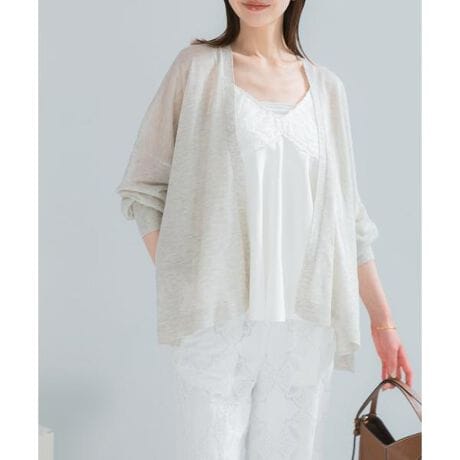 繊細な透け感が魅力の、軽やかなシアーカーディガン。ほのかにラメのような光沢を感じる糸と、ほんのりシャリ感のある風合いが、上品で洗練された印象を引き立てます。接触冷感機能付きで、さらりと羽織るだけで快適な着心地に。ゆったりとした着流しデザインが程よい抜け感を生み、動くたびに揺れるドレープが美しいシルエットを演出します。シンプルなスタイリングにプラスするだけで、ぐっとこなれた雰囲気に。きれいめにもカジュアルにもなじみやすく、冷房対策や日差しよけとしても活躍する、着回し力の高い一着です。