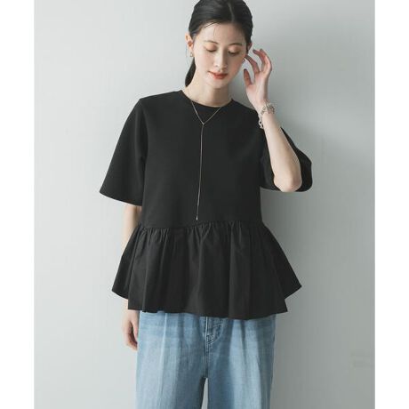 異素材のコントラストが華やかさを添え、一枚で理想のシルエットを描くドッキングペプラムカットソー。