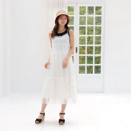 チュールギャザーで表現したデイジーが目を引くキャミ・ワンピース。