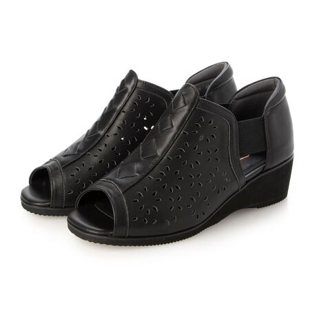 カットワークデザインが華やかな印象のウエッジヒールサンダル。