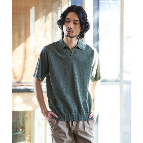 ざっくりとした編地の風合いと首元の上品な開き具合が、リラックスした雰囲気のポロシャツ。