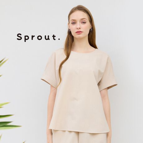 すっきりとしたプルオーバーブラウス。ラグランスリーブに袖口は折り返したデザインでこなれ感のある着こなしに。