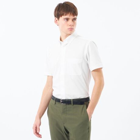トラッドな印象と襟のロール感に上品さのある定番のボタンダウン半袖シャツ。襟先の自然なロール感をきれいに出し、着用時、立体感があり首回りをすっきりみせてくれます。後身にダーツがあり、ウェストを程よくシェイプさせ、体のラインをきれいにみせてくれるシルエットも特長。スラックスや綿パンツなど様々なパンツスタイルで着用いただけます。