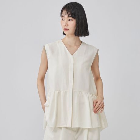 前後差をつけたギャザー切替が動くたびにふわりと揺れ、シンプルなボトムに合わせるだけで上品な印象に。