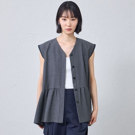 前後差をつけたギャザー切替が動くたびにふわりと揺れ、シンプルなボトムに合わせるだけで上品な印象に。