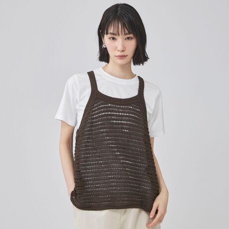襟ぐりと肩紐の編地切り替えデザインが効いたボーダー編み柄ニットキャミソールとシンプルなカットソー。さっと合わせて着るだけでレイヤードスタイルが楽しめます。