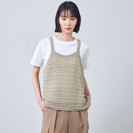襟ぐりと肩紐の編地切り替えデザインが効いたボーダー編み柄ニットキャミソールとシンプルなカットソー。さっと合わせて着るだけでレイヤードスタイルが楽しめます。
