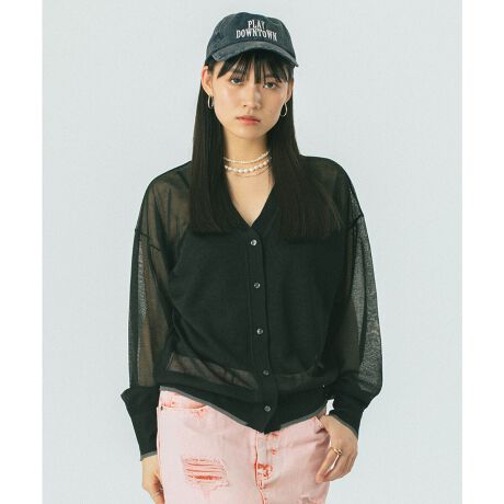 上品な透け感と軽さが魅力、配色アクセントのシアーニットカーディガン