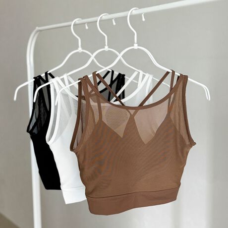 ・シアー素材を重ねたレイヤード風デザインが目を引くカップ付きトップス
