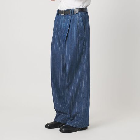 ライトオンスのインディゴストライプ生地を使用した2プリーツ入りワイドパンツ。