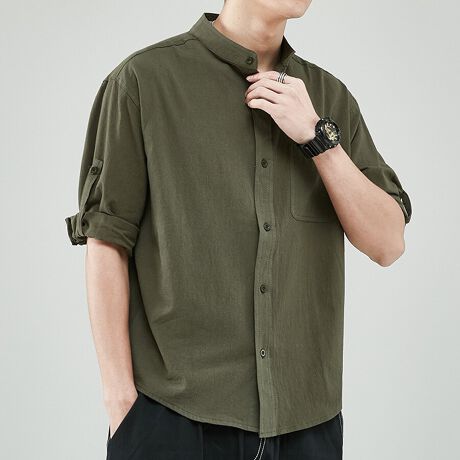 衿を無くしたノーカラーデザインカジュアルシャツ。