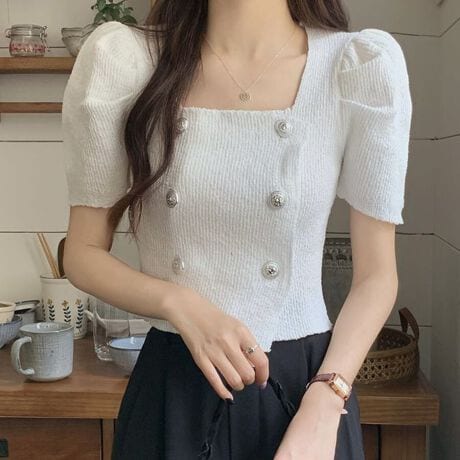 大きく開いた首元とボタンが大人かわいいサマーニット。