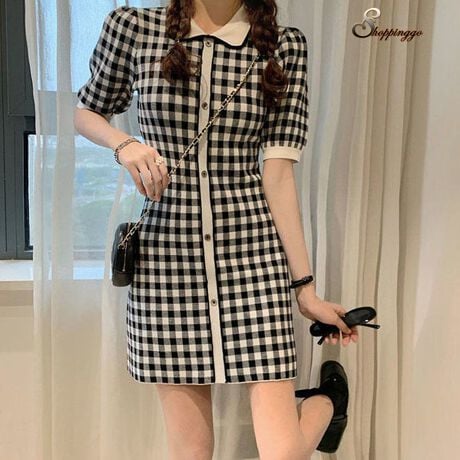 千鳥格子柄の女性らしいデザインのニットワンピース。