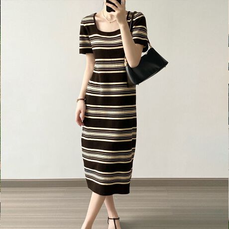 ボーダー柄デザインのロング丈ニットワンピース。