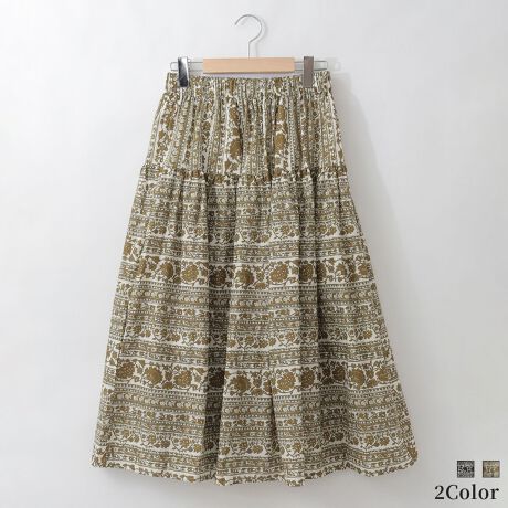 エスニック感漂うフラワーモチーフをシックなカラーで上品に仕立てたフレアスカート。