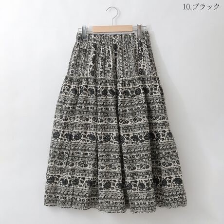 エスニック感漂うフラワーモチーフをシックなカラーで上品に仕立てたフレアスカート。