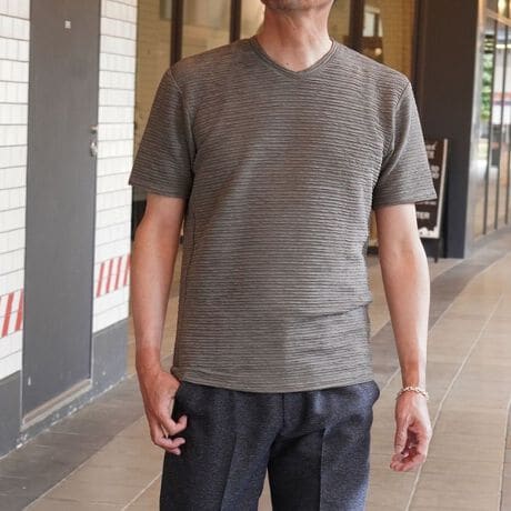 立体感のある凹凸柄が独特な印象を与えるVネックプルオーバーになります。シンプルなデザインが大人受けする上質なカットソーとなっています。