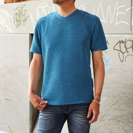 立体感のある凹凸柄が独特な印象を与えるVネックプルオーバーになります。シンプルなデザインが大人受けする上質なカットソーとなっています。