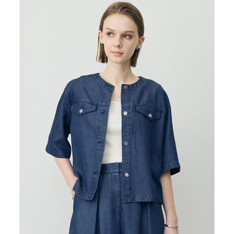 ■デザインベーシックなGジャンのディテールをベースに、今シーズンらしいバランスに仕上げたクロップドジャケットです。ノーカラーでスッキリとした襟周りと、程良くゆったりとしたサイズ感が特徴で、メタル釦がアクセントになっています。同シリーズのタックワイドパンツやワンピースと合わせた、こなれ感のあるセットアップスタイルもおすすめです。オフィスカジュアルから休日のリラックススタイルまで幅広いシーンで着回せる一枚です。
