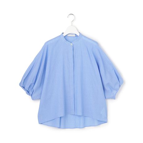 ■デザイン一枚着としてはもちろん、羽織としても決まるポンチョ型のシャツブラウスです。 ゆったりとした袖口は、共布の紐をドローストリングすることでギャザーが寄り、お好みに合わせてシルエットの変化をお楽しみいただけます。首元はすっきりとしたバンドカラーで、前後差のあるステップヘムデザインが、横から見た際も決まるシルエットを演出します。