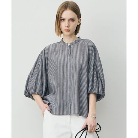 ■デザイン一枚着としてはもちろん、羽織としても決まるポンチョ型のシャツブラウスです。 ゆったりとした袖口は、共布の紐をドローストリングすることでギャザーが寄り、お好みに合わせてシルエットの変化をお楽しみいただけます。首元はすっきりとしたバンドカラーで、前後差のあるステップヘムデザインが、横から見た際も決まるシルエットを演出します。