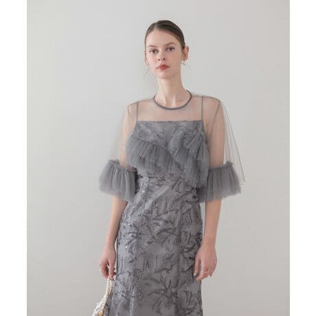 チュールボレロは、袖口に向かって緩やかに広がるフレアスリーブにティアードフリルをあしらい、華やかな動きをプラスします。