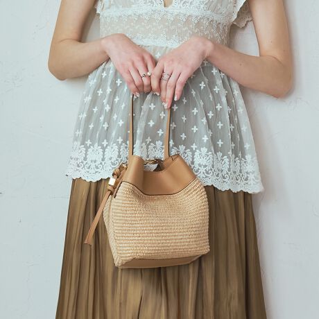 ナチュラル素材とキャメルカラーを掛け合わせた、温かみのあるナチュラルバケットバッグ。