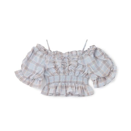 ふわりとしたボリューム袖とペプラムデザインが目を惹くチェック柄のガーリーブラウス。