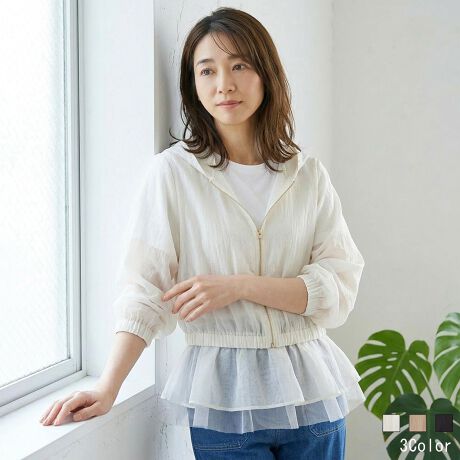 タンクトップはギャザー切り替えで立体的に仕上げた、ペプラムフレアのチュールレイヤードデザイン。
