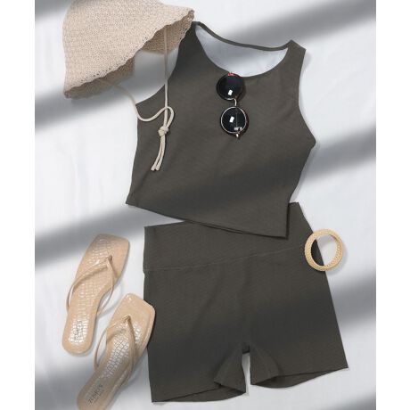 柔らかなリブ生地の上下セットアップ水着。