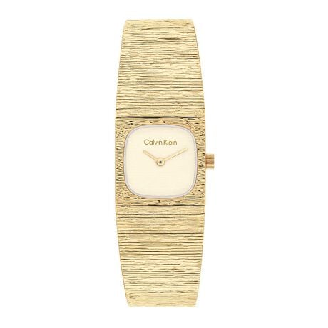 文字盤はロゴと針のみ。あえて余白を広く持たせることで、バングルの複雑な質感とのコントラストを生み出し、CalvinKleinらしいモダンな静寂を表現しています。