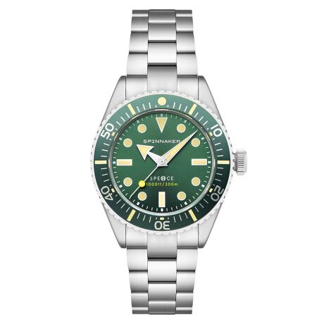 「スペンス300 オートマティック」は、スピニカーが誇る高度な設計と切削技術、職人による丁寧な組み立て技術の結晶です。細部にいたるまで緻密に設計されたパーツが寸分の狂いもなく組み合わさり、300mもの防水性を実現。その上でケース厚10.9mmというスリム化を達成しました。同程度の防水性を叶えるのに、12〜14mmの厚みを設けることが一般的なことを考えれば、これは驚異的な薄さです。“ロープロファイル”シルエットでありながら、決して控えめではないポテンシャルを備えています。