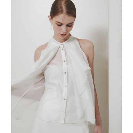 張りのあるシアー生地を2枚重ねることでちょうど良い透け感を実現させたエアリーなブラウス。トレンドのアメリカンスリーブからたっぷりのフレアードレープが裾に向かって贅沢に施されています。ビジューボタンがアクセント。