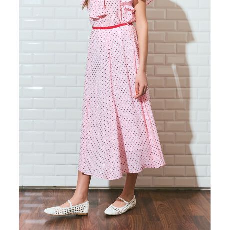 ほどよい肉感ときれいなドレープ感のあるレーヨン素材のグランドに、ハート柄にも見えるドット柄を織り込んだカットジャガード地のきれいなシルエットのスカート。