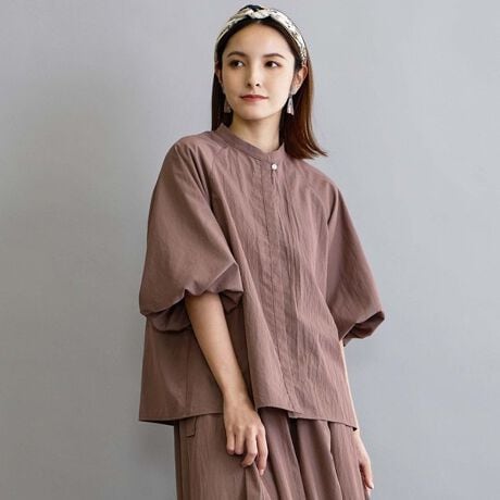 バルーン袖がかわいらしいスタンドブラウス。前あき仕様なので羽織としても活躍します。