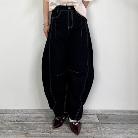トレンドのバレルシルエットのカジュアルパンツ。