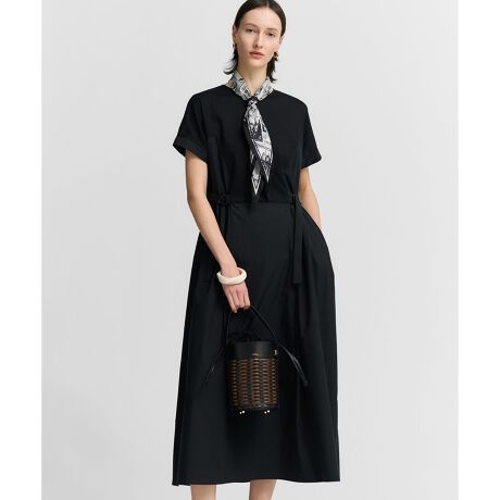 身頃には着心地の良いジャージー素材、袖下からスカート部分には軽やかな布帛素材を組み合わせた、異素材コンビのデザインワンピースです。ウエストサイドに施されたバックルを絞ることで、シルエットにお好みのメリハリをつけることができ、今年らしい着こなしを楽しめます。一枚で様になるデザインながら、身頃は体になじむ素材感でリラックスして過ごせるのが魅力。きれいめな小物を合わせれば通勤やオフィスシーンに、サンダルやスニーカーでカジュアルダウンすれば休日のお出かけにもマッチし、オンオフ問わずマルチに活躍します。カラーは、落ち着いたトーンで知的な印象のダルブルー(#074)、洗練された雰囲気で着回しやすいグレー(#004)、シックでシーンを選ばないブラック(#005)の3色展開です。