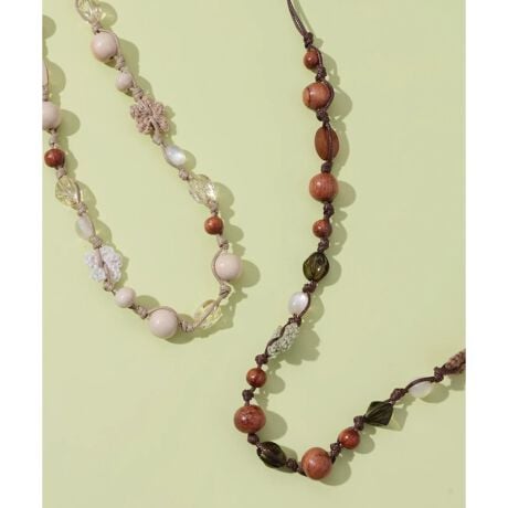 レース編みのフラワーモチーフとウッドビーズやストーン風のクリアビーズを組み合わせたデザイン。