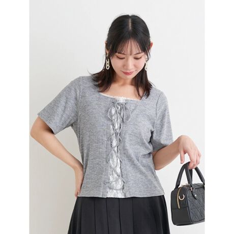 レイヤード風レースアップリブトップス