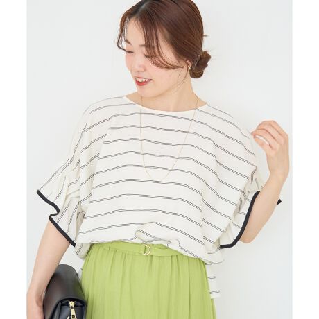 ふんわりとしたフォルムの袖が印象的な、ボーダー柄のブラウス。
