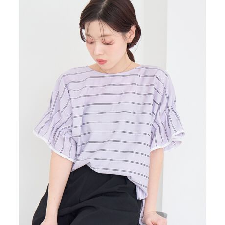 ふんわりとしたフォルムの袖が印象的な、ボーダー柄のブラウス。
